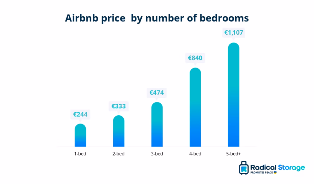 - Airbnb costs increase with the number of bedrooms, rising from €244 for one-bedroom listings to €1,107 for properties with five or more bedrooms.