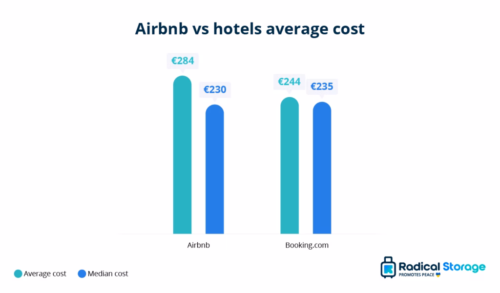 When using median prices, the difference between Airbnb and hotels becomes much smaller. The median Airbnb stay costs €235, while the median hotel stay is €230, leaving only a €5 gap between the two. This contrasts with the wider difference in average prices and shows how a small number of high-priced listings can pull Airbnb’s mean upwards.