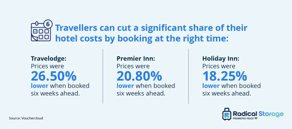- Hotel prices are lowest five to six weeks before travel, with average rates falling by around 20 percent compared with booking one week in advance.